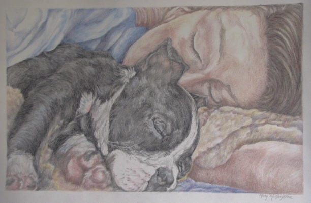 We could be two inches tall as we enter this magnified view of Jess and Frankie, We become part of a sentimental moment when the dog nestles into the arms of his mistress peacefully asleep. Included are the contour or line drawing, a partially completed gradation, and the final drawing in color pencil.