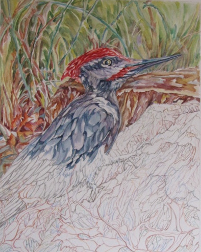 This is the next stage as I finally get to laying in the watercolor washes for the pileated woodpecker. It was seen in my daughter and son in law’s yard feeding on insects from a dead tree stump. I will add colored pencil