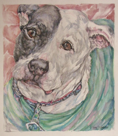 This is the final version of Edie; a drawing for Deviant Art. I previously posted the contour or line drawing and the contour supported by watercolor washes. This last stage entails layering colored pencil over the watercolor to give the drawing added impact. I am struck by how sweet this puppy is!! What kind eyes she has!!