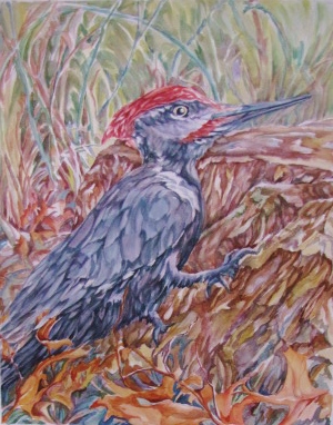 This is the next stage completing the washes of watercolor for the pileated woodpecker. This leg in the journey accomplishes a roughing in of the colors and composition. I currently am using watercolor to allow greater freedom with my drawing and provide more intensity. Do many of you work with mixed media and if so, what are your techniques?