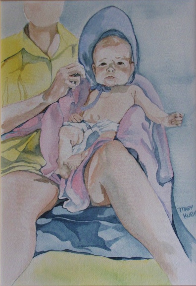 This is a watercolor of my Mother holding my sister, Karlin. My Mother’s form was not completed with detail, but instead was used a stabilizing and supporting element surrounding the baby. Notice how the arms and legs of the mother leads you into the area of focus; the child.